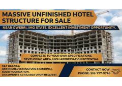 Unfinished Hotel Project for Sale Near OwerriReal estate - - January 20, 2026 Check with sellerUnfinished hotel structure available for immediate sale near Owerri, Imo State. excellent opportunity for investors to complete to their own specifications. Situated in a developing area with high appreciation potential. Ideal for diaspora buyers loo...